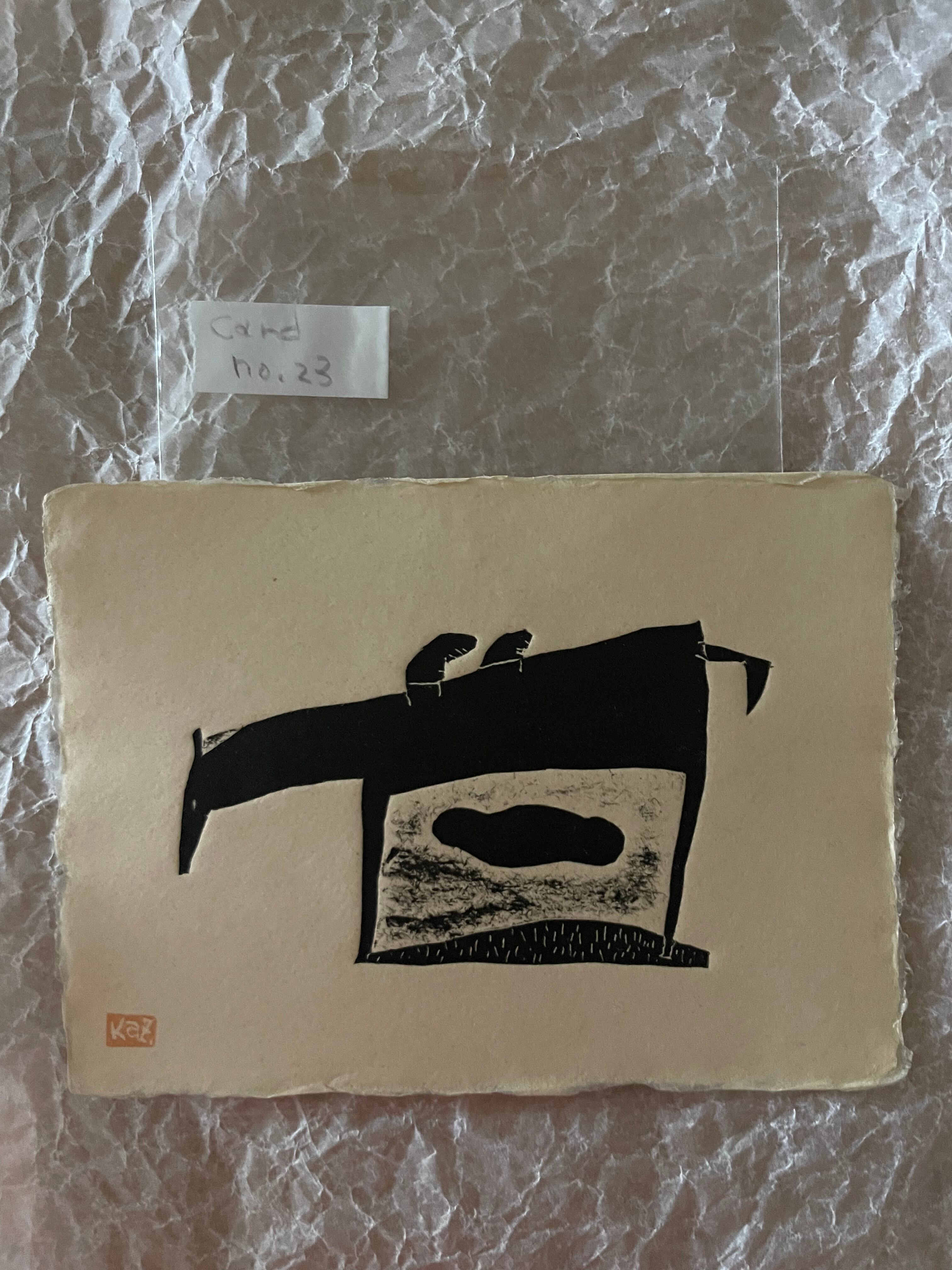 今は廃盤になったハガキサイズの耳付き手漉き和紙に、紙版画を凸版刷りで刷ったものです。