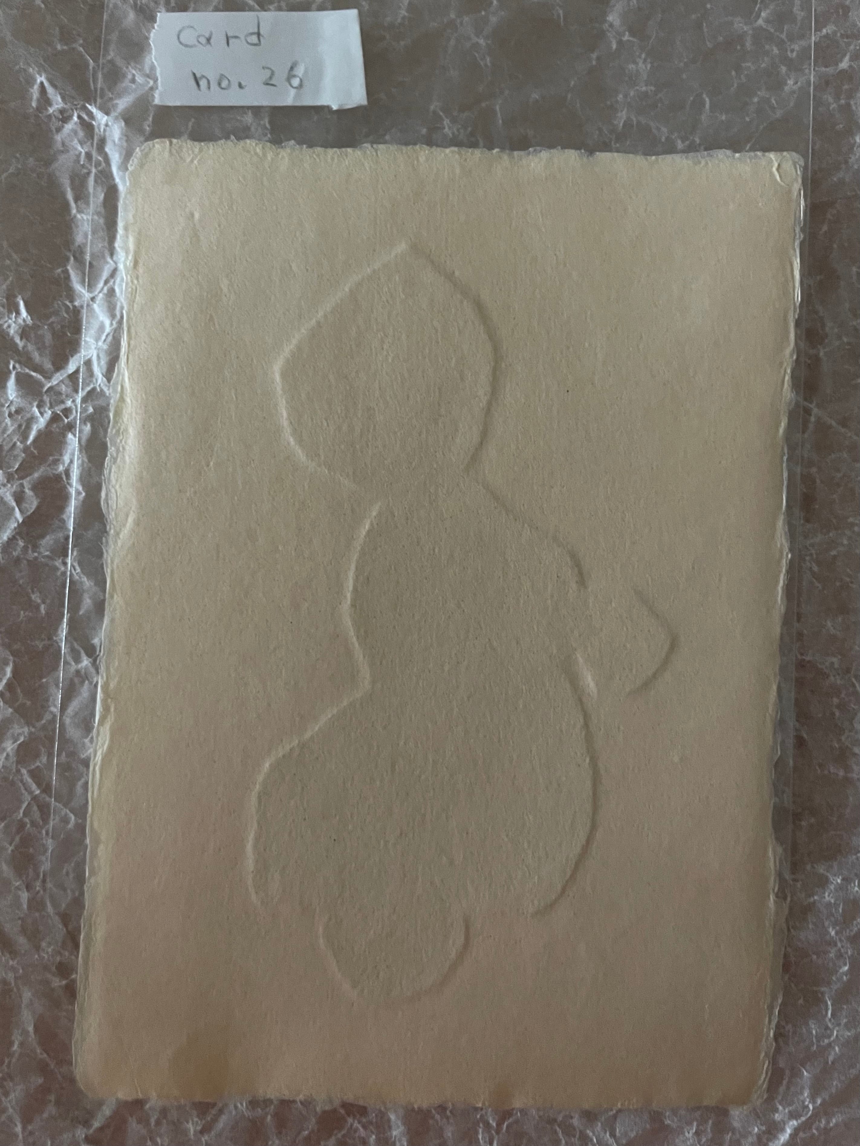 今は廃盤になったハガキサイズの耳付き手漉き和紙に、紙版画を凸版刷りで刷ったものです。