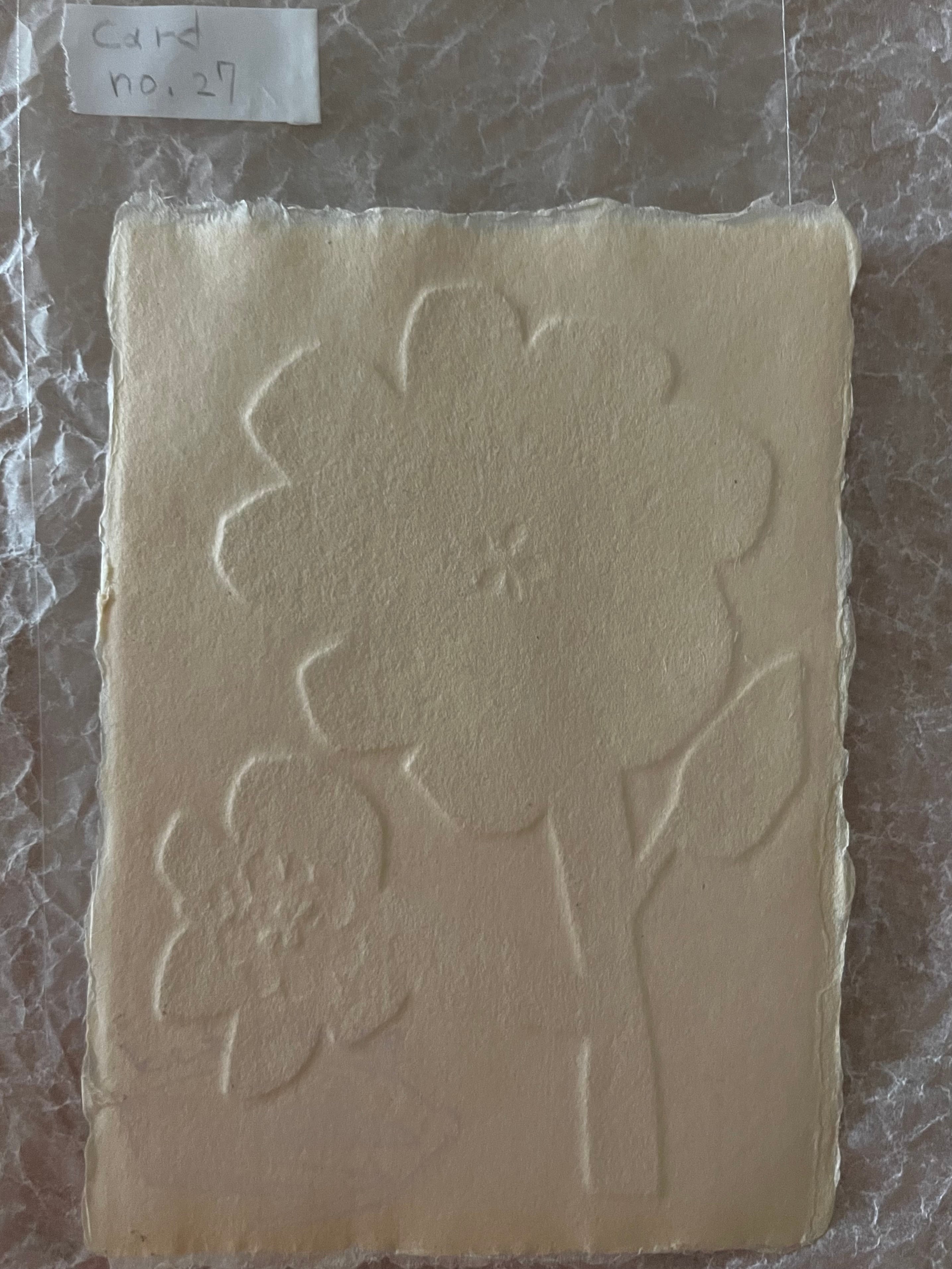 今は廃盤になったハガキサイズの耳付き手漉き和紙に、紙版画を凸版刷りで刷ったものです。